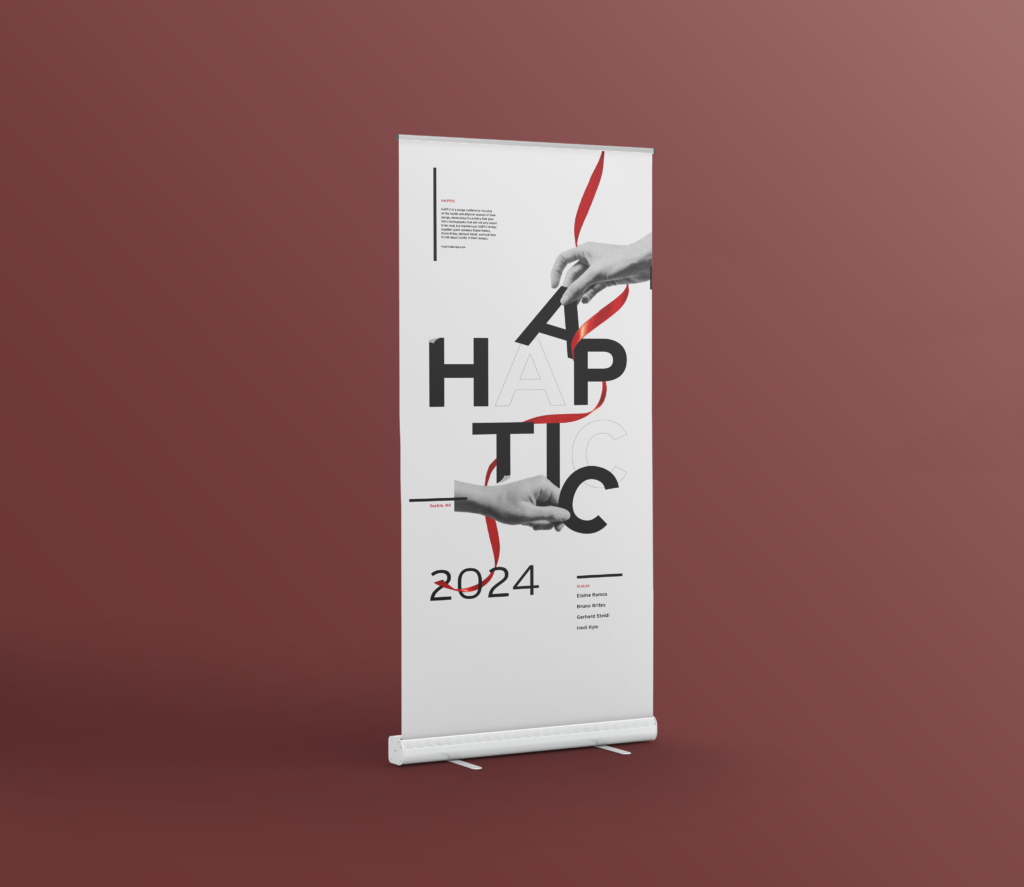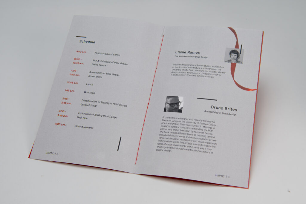 HAPTIC is a fictional design conference that focuses on creating a distinct brand identity based on the tactility and physical aspects of book design. It showcases the artistry that goes into creating books that are not only meant to be read but experienced. HAPTIC brings together guest speakers Elaine Ramos, Bruno Brites, Gerhard Steidl, and Hedi Kyle to talk about physicality in their designs.