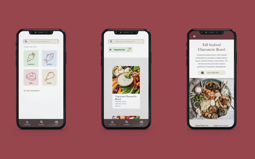 The website focuses on offering an array of recipes with guided instructions and featured wines, while the app acts as a shopping list to help aid in the gathering of ingredients to assemble the perfect charcuterie board.