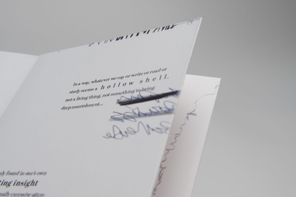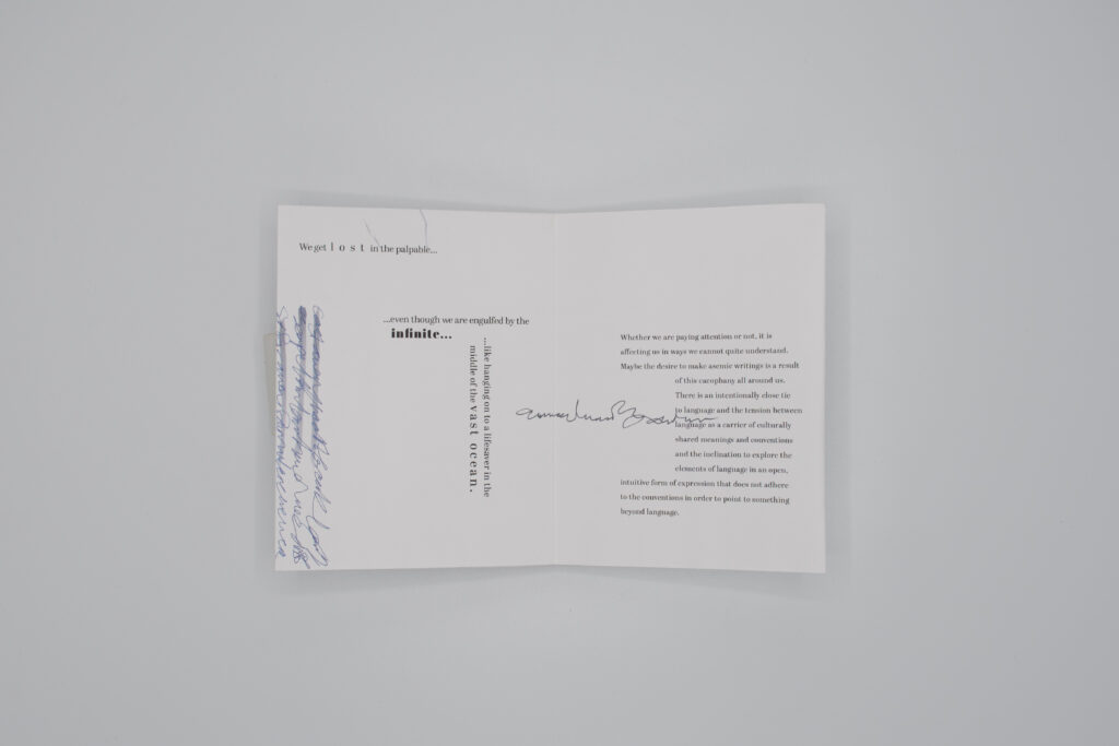 A series of four booklets discussing asemic writing – a wordless, open semantic form of writing — and mark-making. Through abstract visuals and enigmatic symbols, it conveys the theme of scattered and overlapping thoughts to shine forth and allows a myriad of voices to converge on the page.
